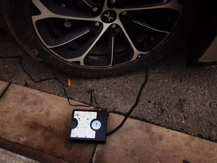今早起来启动车辆,发现车辆左前胎压异常,从昨天的2.5bar降到0bar,本着试试的态度,看能不能打点气压,撑着去附近修理店补胎!然后掏出了车上的应急救援包,先把气压达