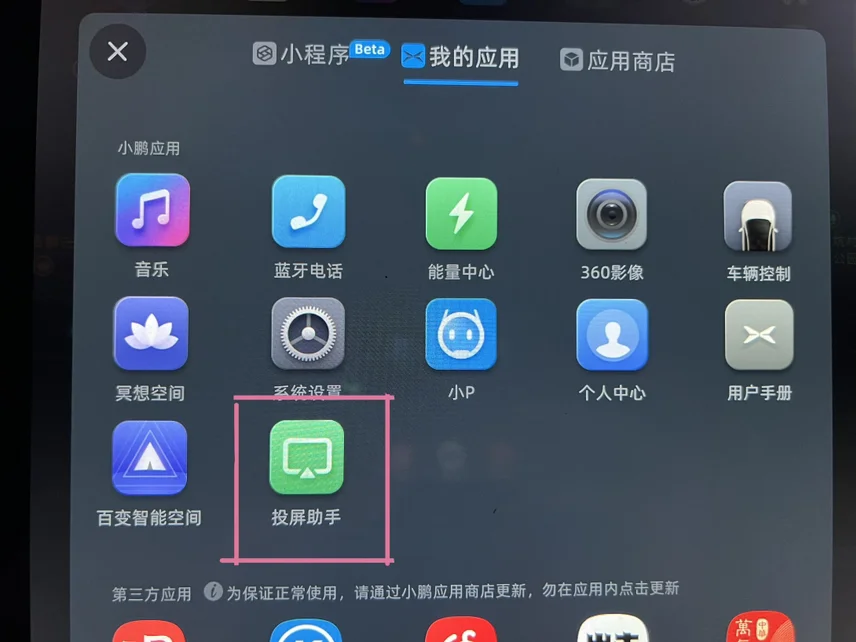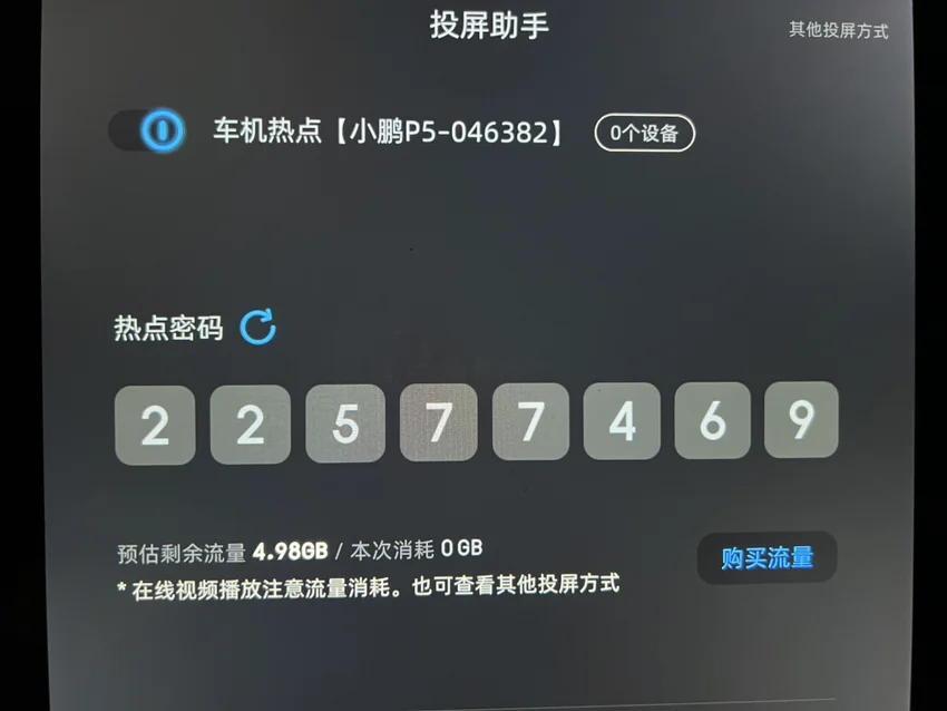 本人是苹果用户,车辆升级后在下拉菜单栏有投屏助手的快捷功能,点击后即屏幕根据屏幕提示链接对应热点输入密码,再通过手机菜单栏投屏功能即可实现投屏功能(全屏投屏)。