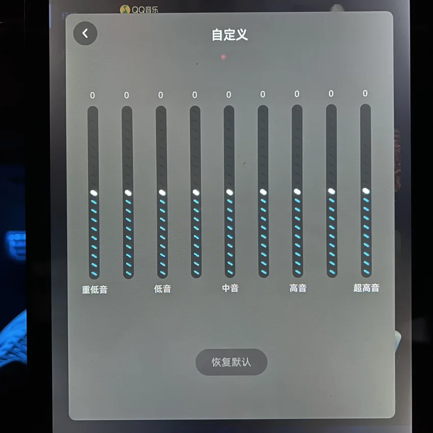 此次升级也带来了全新的EQ均衡器调节,通过音乐界面选择即可进入,点击自定义,再次点击即可进入EQ调节页面,目前暂未进行音质调试。正常我都是通过手机蓝牙进行音乐播放,目前个人有酷狗音乐Vip,网易云黑胶会员,QQ音乐绿钻。