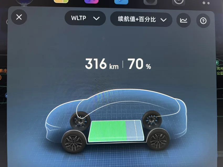在屏幕左上角处有电池图标,进行点击修改后可展现电池的百分比和续航里程,且仪表会同步进行调整。个人认为是比较实用的功能,在能够显示车辆的电池百分比,一目了然可以在30%-80%区间进行补能。有效保护电池的寿命健康!