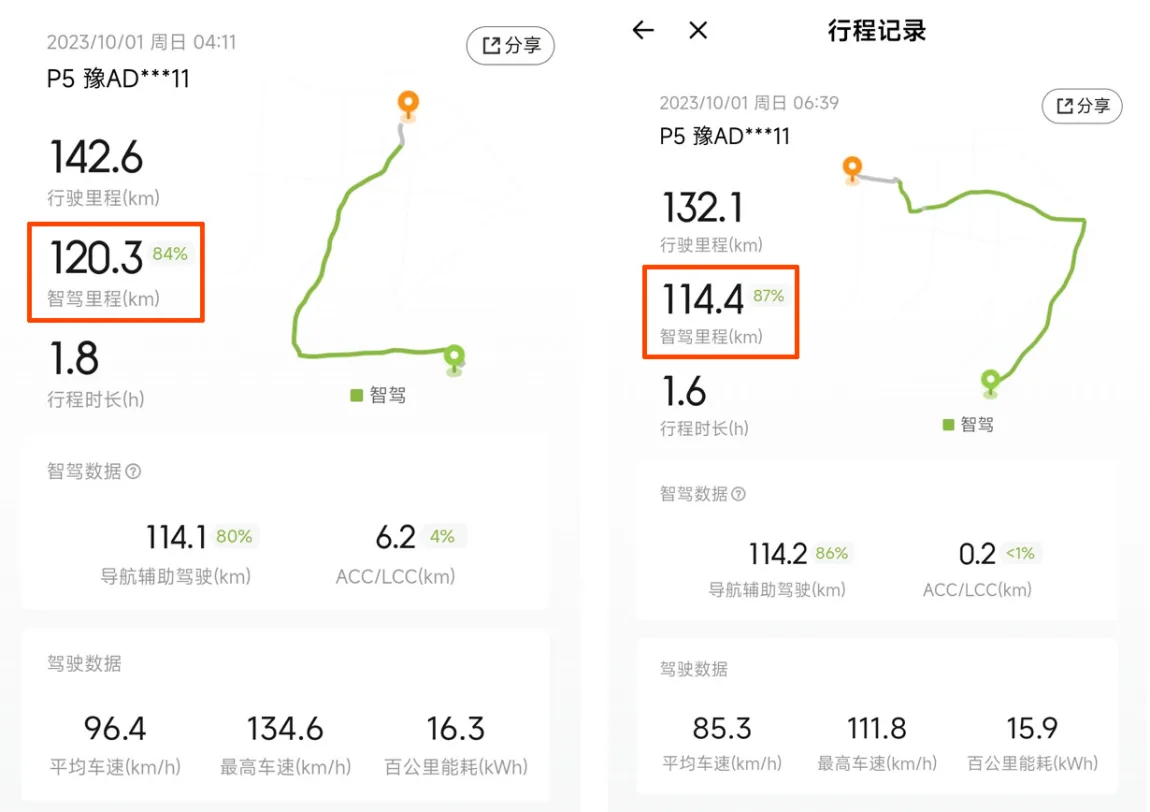 第二天查看自己的行程记录才发现,280km的路程,智驾里程居然达到了234km,使用比例达到了83%,也就是说,其实这段路大部分是小P在开。自从有了NGP,确实让长途驾驶不再成为一个疲劳的事,反而很轻松的就到达的目的地。在部分路段,因为高精地图缺失,导致了降级,也希望可以尽快完善地图,这样就能体验丝滑无降级的NGP啦。