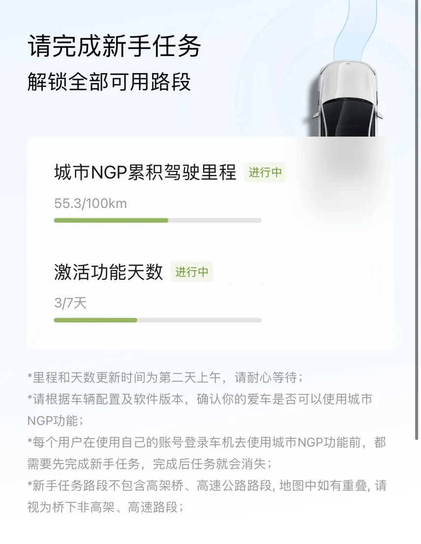 最要紧的当然是XNGP的城市辅助驾驶功能了,买车的时候就是冲着这个功能来的。7天100公里的新手村任务,只能在指定的道路上使用。但是覆盖面还是很广的,使用道路在我生活的区域周边更是密集,这几天下来已经完成了一半的任务进程。并且好几次都达到80%以上的路程使用辅助驾驶完成。