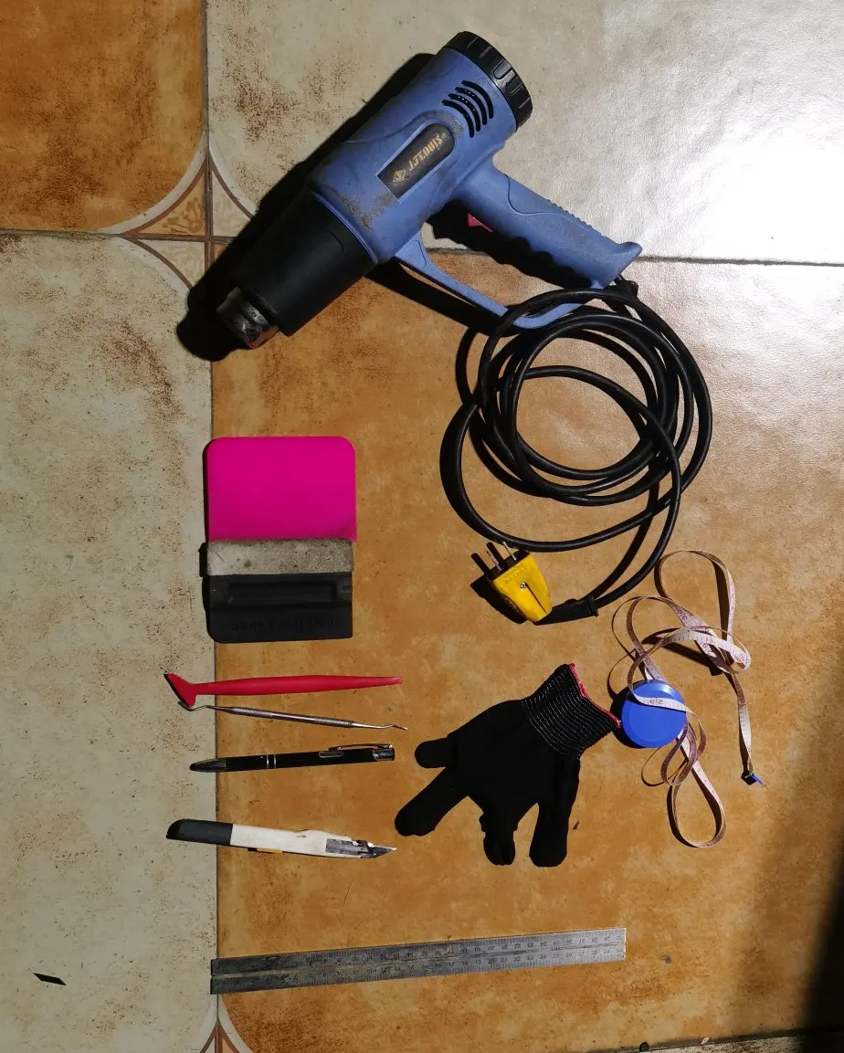 工具准备: 温控热风枪,无纺布手套,切纸刀,刮板,收边工具,卷尺