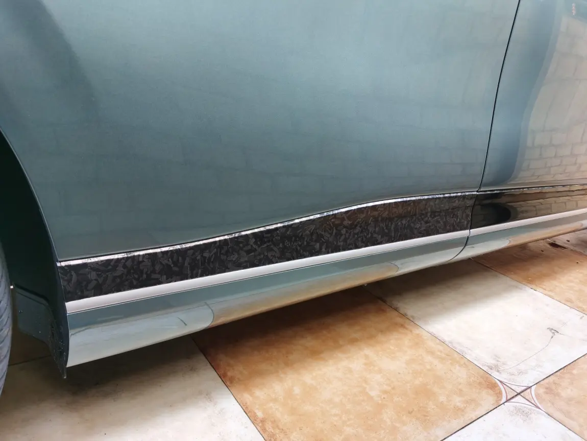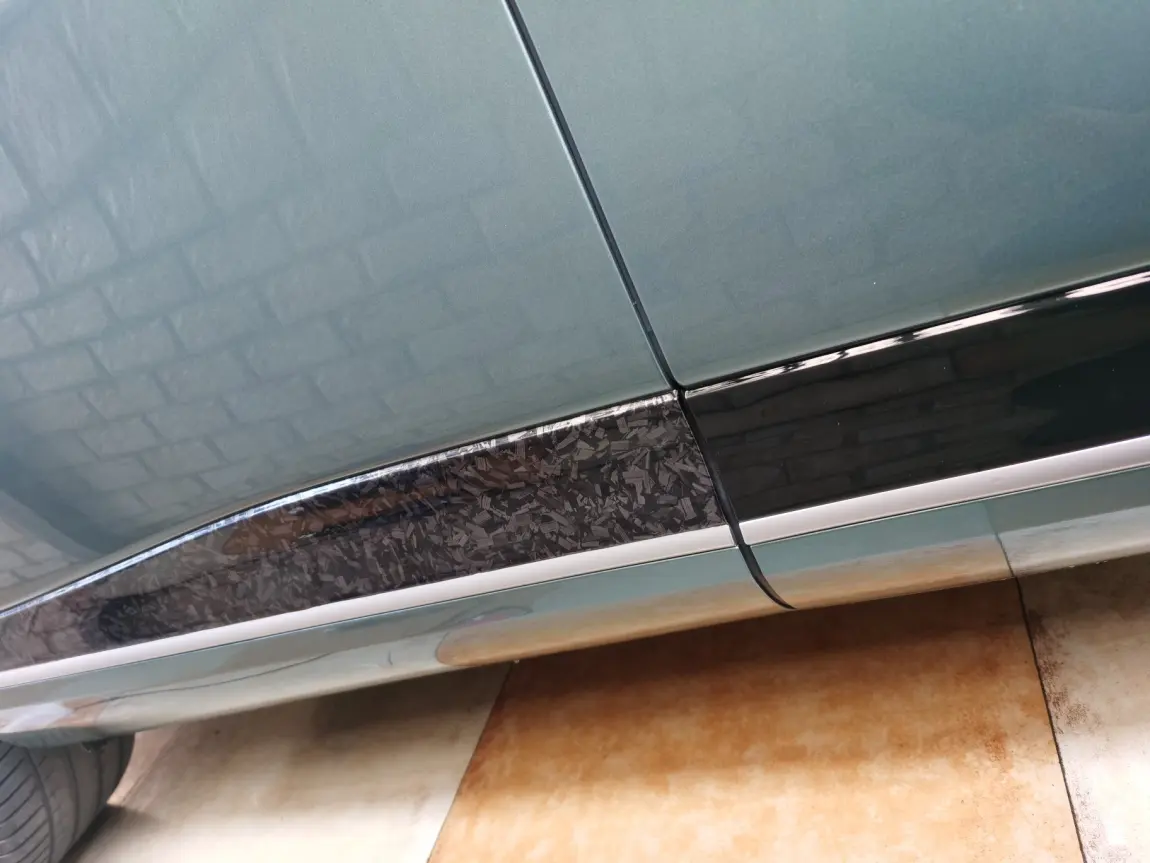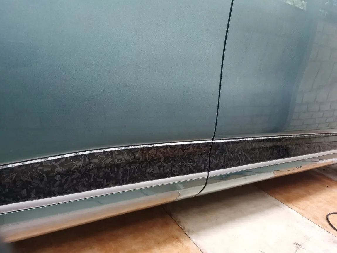 G9车身下方设计了一圈亮黑面的饰面板,容易有划痕,有灰尘也显脏,那就贴个膜吧,拼夕夕上采购了1米长1.52米宽锻造花碳黑碳纤维改色膜,1米50多元,车后方近三米长的饰板采取拼接粘贴,不拼接要购买三米材料,用不完会留下了很多材料