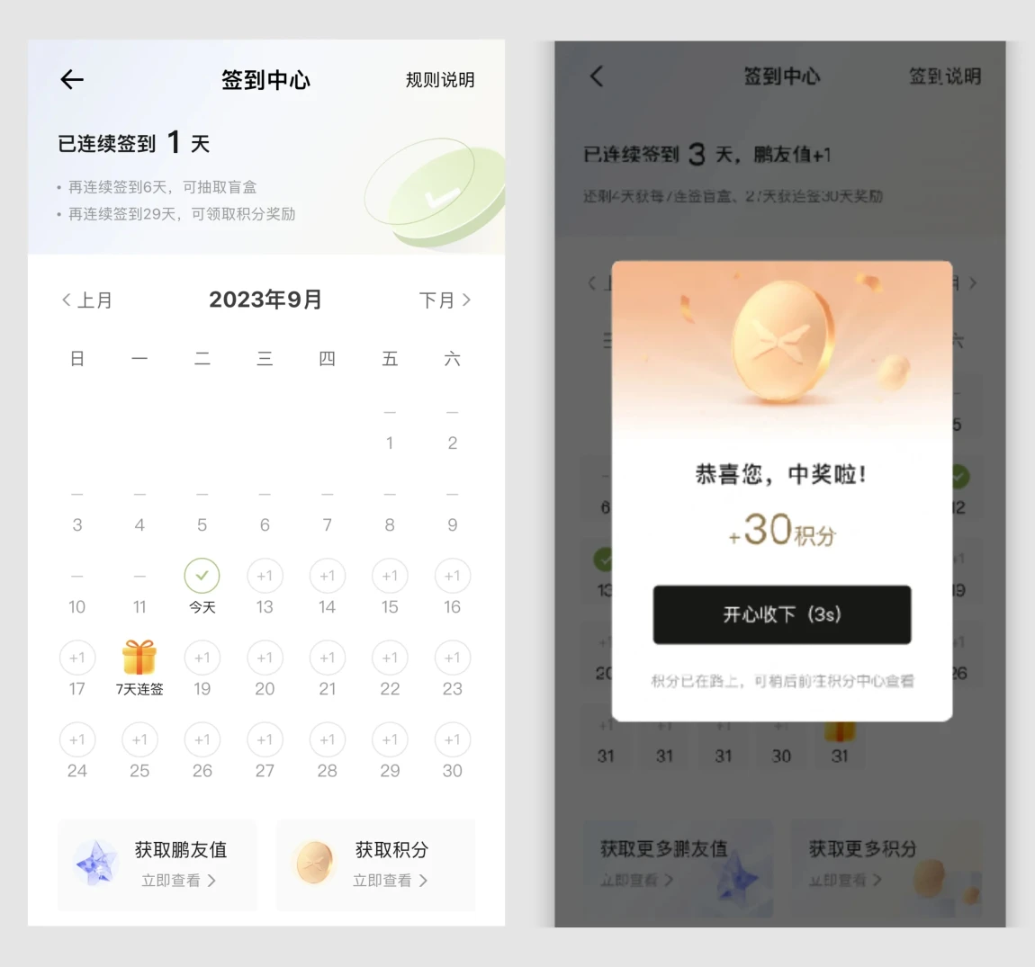 😎鹏友们好!今日的社区有奖话题讨论来了,参与可获积分奖励哦,欢迎鹏友们加入讨论!🎉🎤🎤你会每天在社区签到吗?连续签到多久了?你在签到中心都获过哪些奖励?盲盒抽中过哪些惊喜好礼?快来评论区晒出你的签到奖励吧!欢迎晒图哦~🙋♀️温馨提示:您可以通过App-发现-右上角进入签到中心~👇🏻【有效时间】2023年11月6日10点-2023年11月7日10点