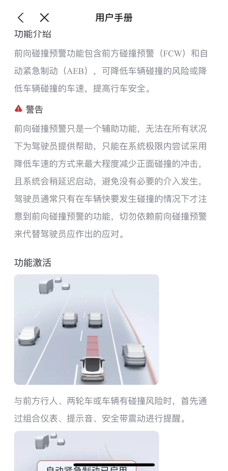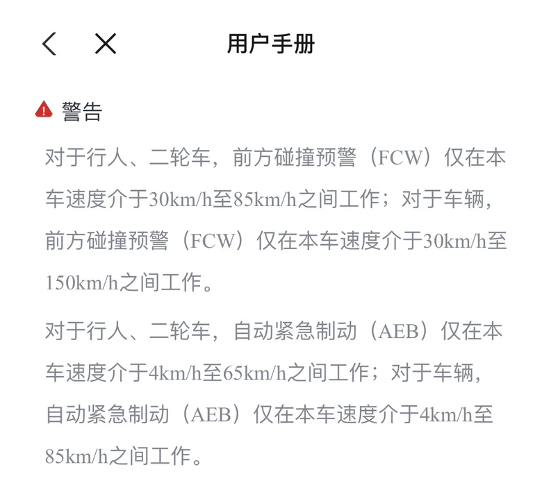 至于中高速的刹停,我没有触发过。但是如果你细心一点,去查看用户手册,就可以看到小鹏关于AEB的触发说明:在在识别行人、二轮车时,本车速度介于4-65km/h之间工作;对于车辆,仅在4-85km/h之间工作。AEB作为一个辅助功能,系统会采用降低车速的方式最大程度减少正面碰撞的冲击,且系统会延迟启动,避免没有必要的介入发生。也就是说,触发AEB的时候,系统会进行减速减轻碰撞的冲击,这里的机制就是,允许与前车进行碰撞,但不一定会瞬时刹停,因为在中高速行驶过程中,急刹车会容易给后车造成追尾。这里其实也有一个争议点,就是如果车子不把车刹停,那我撞了前车岂不是变成我追尾全责了?我想说,这种情况下,人的安全一定是大于交通事故的责任划分的。