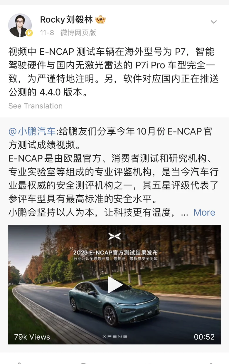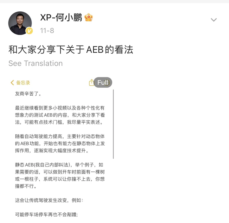 各家汽车厂对于AEB的触发条件没有一个统一的标准,每一家都有不同的理解,调教的风格也不一样,对于误刹和正确触发的临界值,没有一个界定的标准。AEB也不是智驾的全部,只是智驾主动安全的一个部分,所以外界测试或者舆论认知把AEB不容易触发当作为是小鹏的智驾不行,这样的论断,无疑是不正确的。