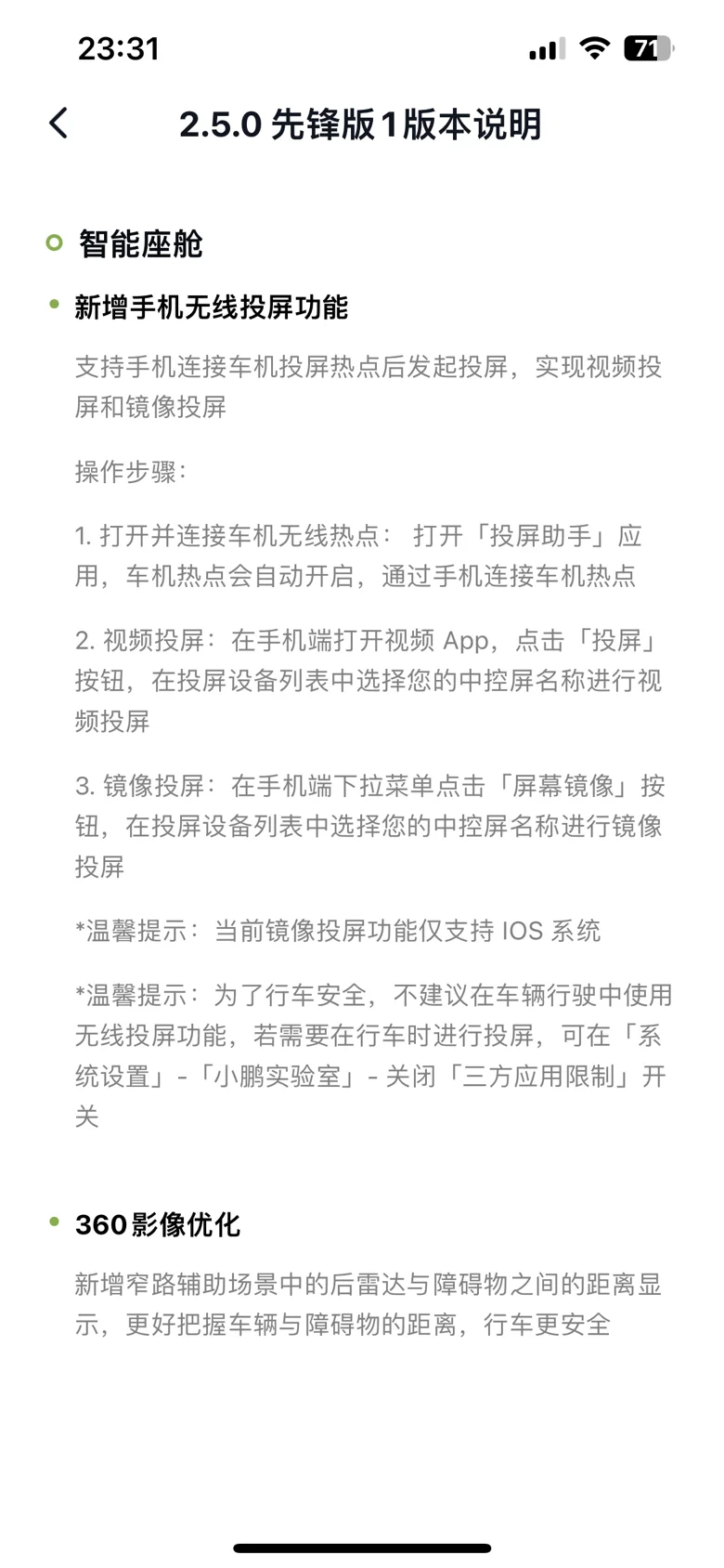 今天半夜,收到小鹏2.5.0先锋版1版本升级的提示,现在小鹏可以支持手机无线投屏,且360影像进行了优化,新增了窄路辅助场景中的后雷达与障碍物之间的距离显示。#G3 XmartOS 升级尝鲜#@OTA小助手