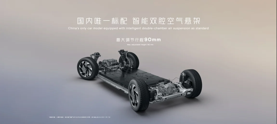 全系标配,不玩套路:小鹏X9还是国内唯一全系标配智能双腔空气悬架(包含智能双腔空气弹簧+智能可变阻尼减震器)车型,最大调节行程 90mm。按照何小鹏的说法:市面上的七座车开起来油腻、笨重、不灵活,不年轻而且不聪明,而X9是我开过所有MPV里面最好开的。我相信何总说的大实话,这么好的功能就该全系标配,好马配好鞍,X9配空悬。
