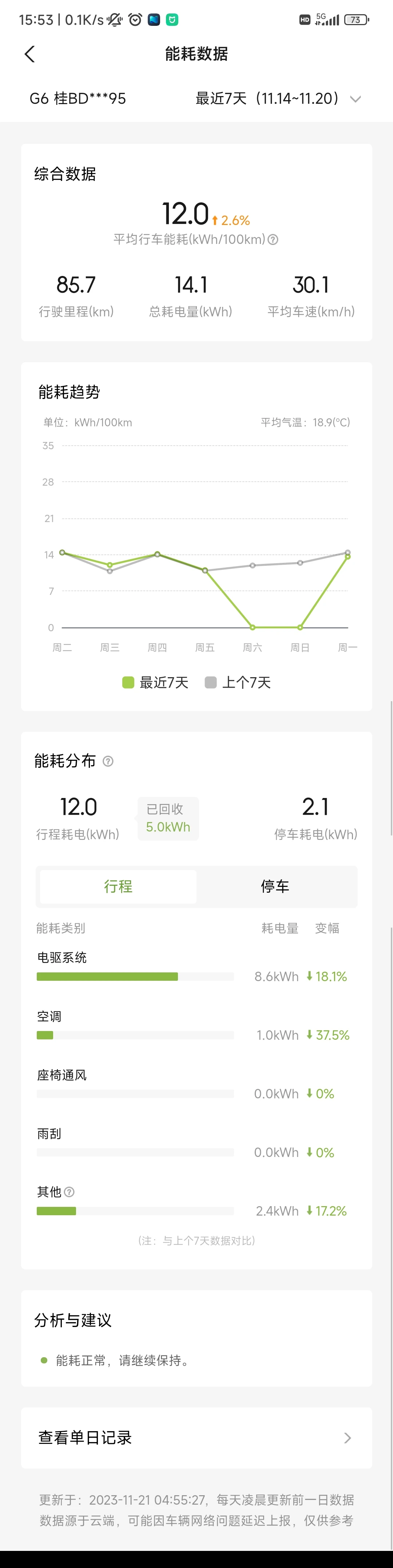 综合这几周的能耗表现,我的G6在上述城市路况的平均行车能耗约在12kWh/100KM。与手头的另一辆车重仅860千克的纯电动A00级车宝骏E200的约10kWh/100KM的数据相比,G6的这个能耗表现不可谓不优秀。预估在南方城市路况,580的G6满打满算能跑出500公里左右的续航。