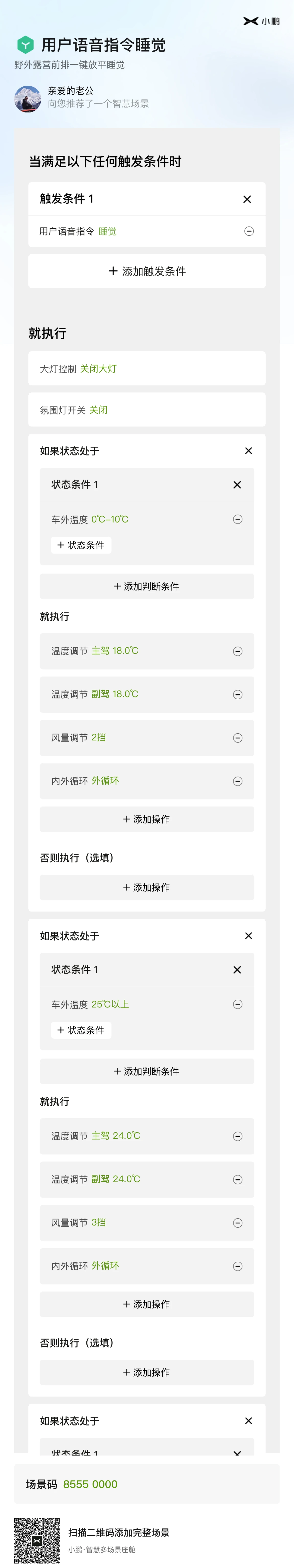 总之,该有的操作基本上都覆盖了,你只需要对小P说睡觉,一切全自动执行!早上起床你只需要说结束露营或者准备出发,座椅将全自动恢复!希望本场景能给鹏友们的露营体验锦上添花!有不满意的可以自己手动修改一下,不会的可以联系我私人定制,免费的噢!