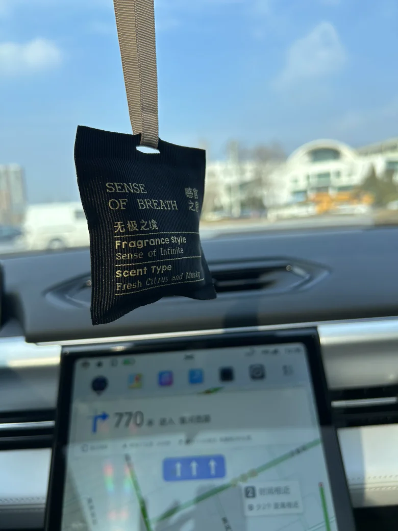 香薰也是必不可少的部分,为了搭配胖5舒适家轿的车设,我搭配了帆布材质的香薰包作为挂饰,既与车的整体风格和谐也增加了帆布材质带来的舒适与温馨感。香槟色与黑金又将精致感与车体颜色融合,让人觉得高级又有亲和力。香味与车载香水比释放的更慢,不会闻久了恶心难受,无极之境的味道也是真心推荐,大家可以tb找一下,39米~