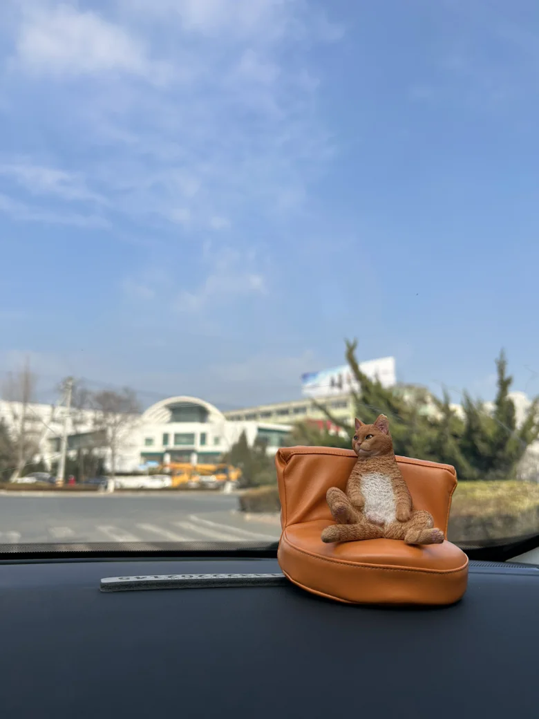 车上的小配饰我选择了和家人有关的元素。我有一只四岁的橘猫好大儿,换新车啦!好大儿也必须有一席之地。于是摆件我选择了好大儿造型的傲娇橘猫,搭配了皮质的小沙发,主打一个该酷酷该暖暖。挪车电话我选择了和坐垫同款翻毛皮材质,直接夹在了沙发下面,简单大方。
