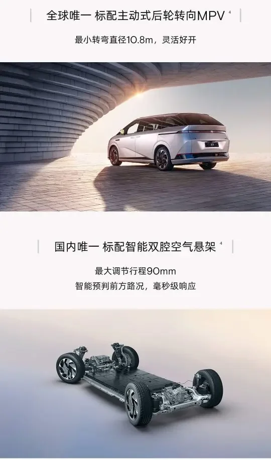 搭配全球唯一标配智能双腔空气悬架,智能预判路况实现毫秒级响应,前后一体式铝压铸车身,从根本上保证我们的每一次安全出行。
