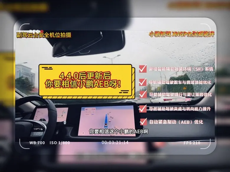 视频第3分29秒处,我们遇到了小鹏本次更新优化后的AEB更加如何人机共驾的理念,更好看更安全。自动紧急制动(AEB)系统更新明细: