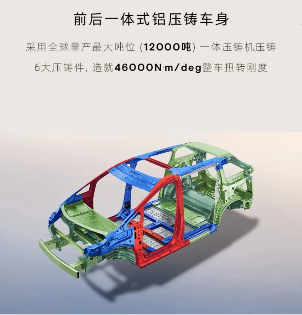 带双腔空悬,后轮包还做到了那么小,小鹏是选择了相对窄的轮胎+减震器、空悬等大件做了创新性的布局,大家可以去看看传统车企是并排放的,这就真的做到了空间极致利用,最最主要的还是小鹏用了最大压铸12W吨的一体式铝压铸,才做到了如此规格的MPV,可以拥有7.7平方空间的MPV奇迹。