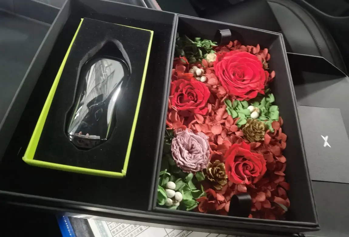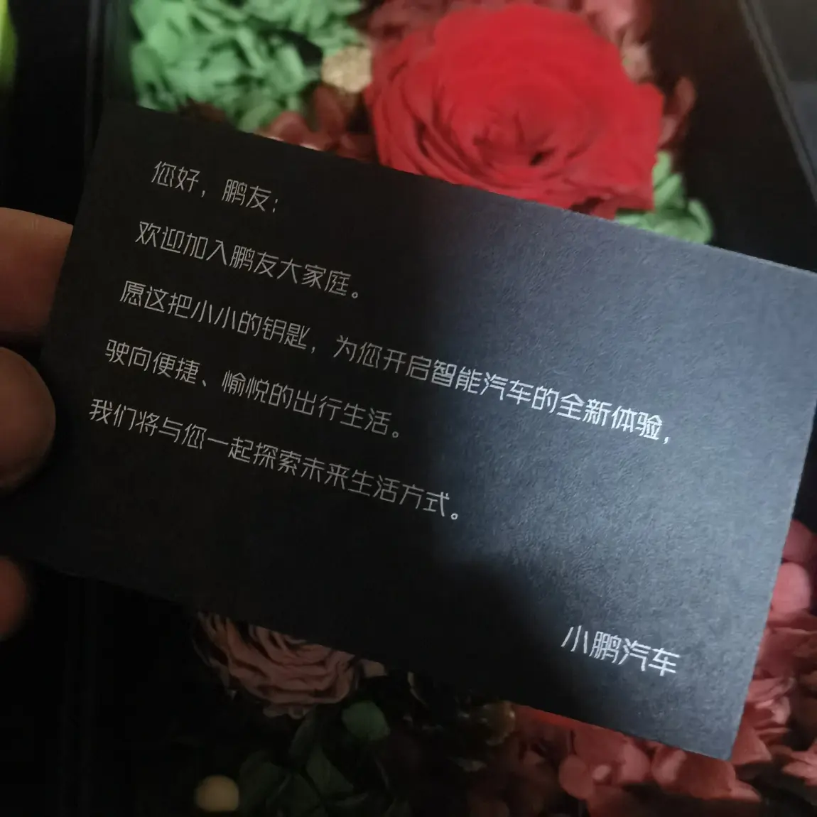去到交付当天还接送我到交付中心,因为时间赶还蹭了个工作餐哈哈,最后验车等一系列流程也非常顺利(幸运拿到个很靓的车架号),交付专员还热情帮我拍了很多照片,给了钥匙的礼盒,里面还有小鹏的一张寄语卡片,仪式感满满!