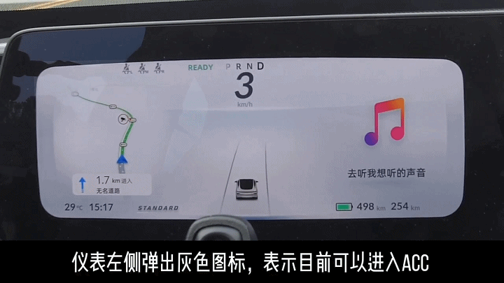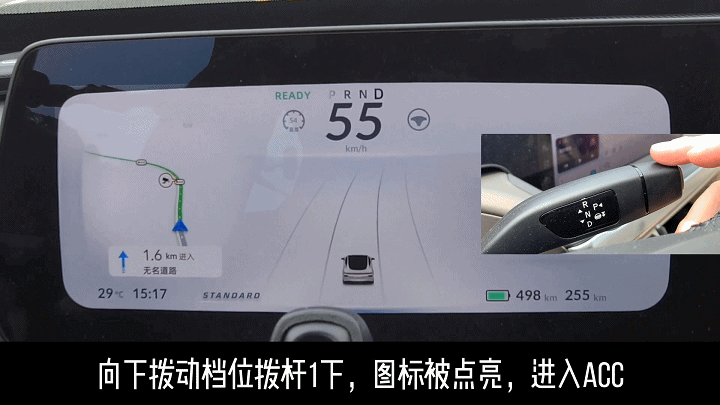 向下拨动1下档位拨杆,仪表ACC灰色图标就会被点亮变成蓝色,表示功能已开启