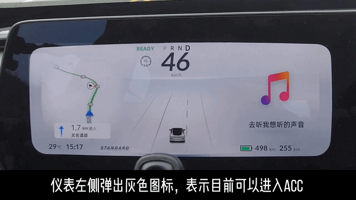 【看仪表】:并不是所有的时刻都适合开启ACC功能(比如:没有跟随前车车速需要达到15km/h,正在跟随前车任何车速都可开启),不要担心难记,系统也会帮助你进行一个判断,如果仪表左边出现下图灰色图标时,表示此时可以进入ACC。