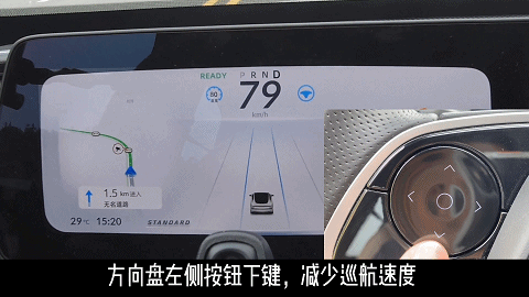 进入功能后,可能对系统设定的巡航速度不满意,可以通过方向盘的左侧上下按键调节速度,每点击一次,巡航速度加减5km/h。