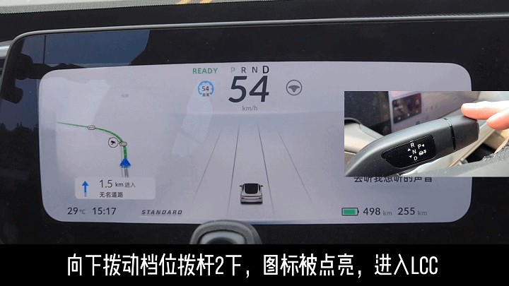 向下拨动2下档位拨杆,仪表LCC灰色图标就会被点亮变成蓝色,并会伴随着"咚"的一声提示音,表示功能已开启。(开启LCC的同时,也会开启ACC)