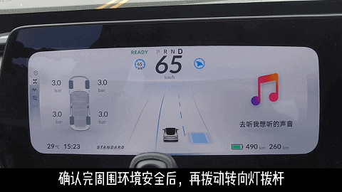 而且这个功能是建立在开启车道居中辅助(LCC)功能之后使用,所以我们先得向下拨动2下挡位拨杆开启LCC,等车速达到65km/h以上,再看看后视镜上是否有黄色警示灯亮起(亮起表示,侧方盲区有往来车辆,需等待),然后打转向灯,等待系统变道。
