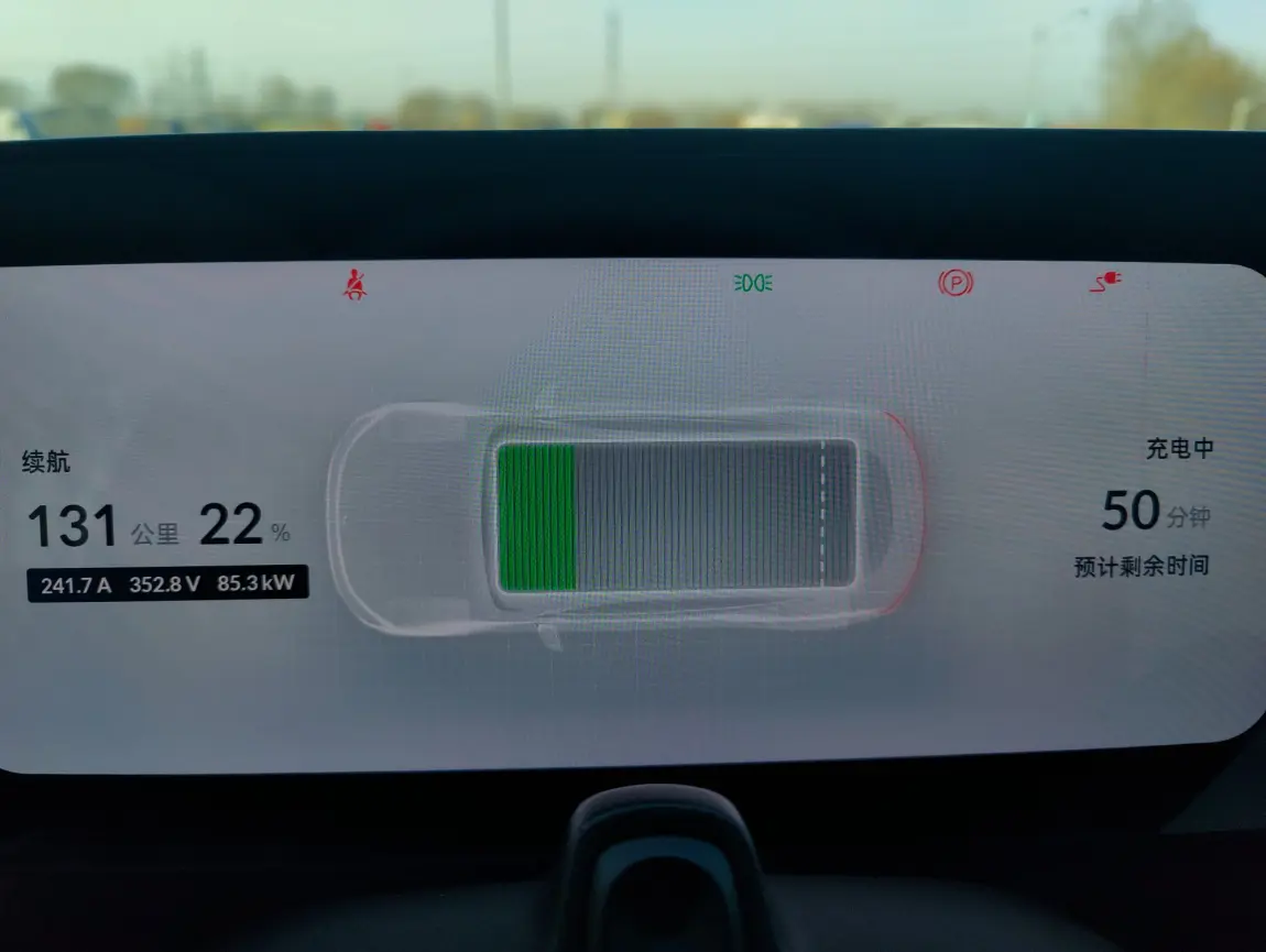 5:45出发,表显续航560km,京港澳一路畅通,车道又多,一半路程都在使用ACC,8:19到达正定,剩余续航109。服务区四个桩全是160kw,比22年跑长途体验好很多,但依然换了两次才充上,功率85+kw,充了一小时到518km出发。