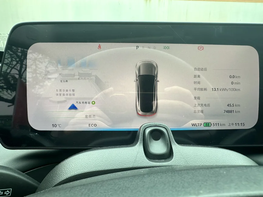 走了25分钟后,正好等红绿灯。看了一下仪表盘发现走了10.9公里,也就是11公里,WLTP续航剩余501km。出发前WLTP剩余511km,也就是说目前是1:1的状态。现在来看看来ECO节能模式还是比较节能的。能耗也保持在13.2,能耗算是一个比较正常的水平。