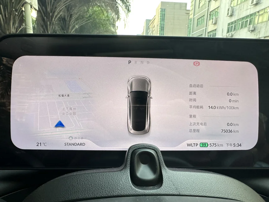 我提前了一天晚上把电充满到576,因为挪车又经常打开后备箱,所以出发前WLTP显示575km。而我的车总公里数也显示了75036公里,刚好7万5千公里了。对于广东的冬天达到21度,所以空调也是得打开的。这次满载5人,行李也塞满前备箱和后备箱。