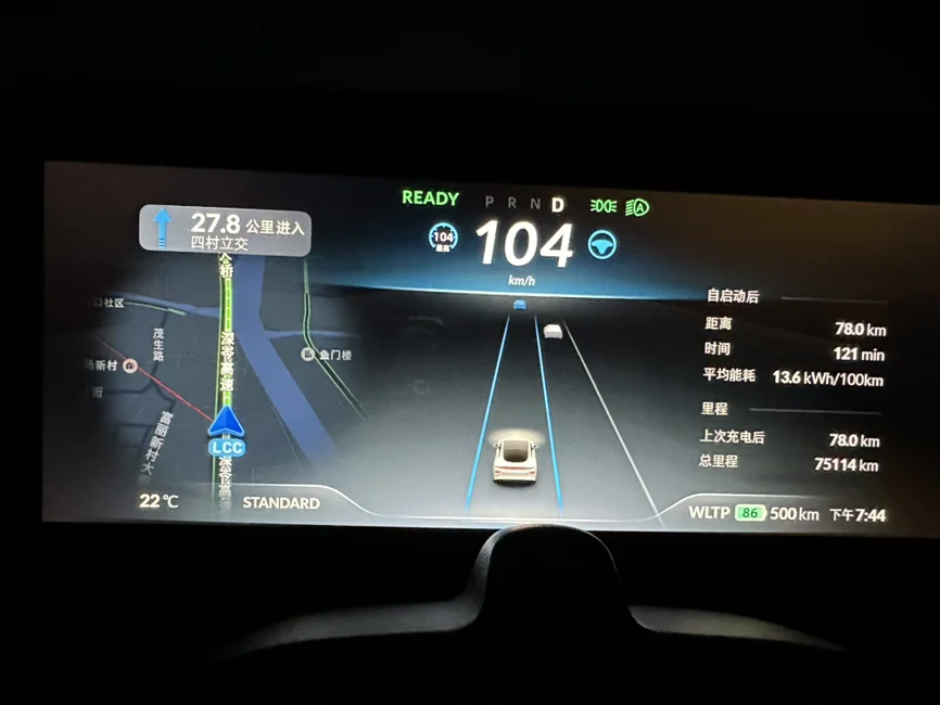 当WLTP还剩500的时候,加上走了78公里,居然还反向虚标3公里。能耗稍微降了一点点,在13.6。在高速上这样的能耗算是比较低了。