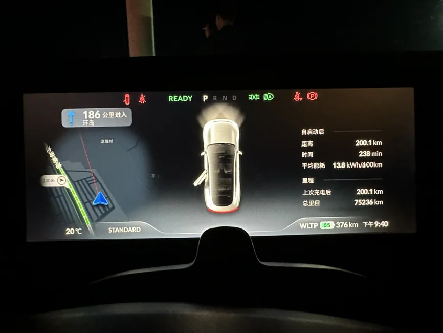 走了238分钟后,刚好走了200公里,一半路,就到了服务区休息了。这时是9点40分了。显示的WLTP还剩376km,可以说前半段路是1:1。满载的情况下这样的续航表现没话说了。