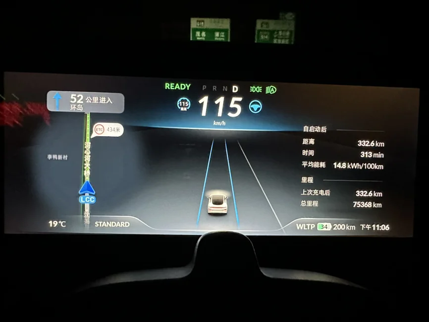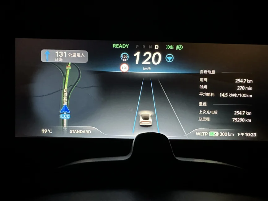 行驶了254.7公里后,表显WLTP还剩300km,因为下半段高速四车道,不算车少,但是能上120速度,所以掉电开始打折。走254.7公里用掉275公里续航,九三折,还算ok。能耗在14.5左右。