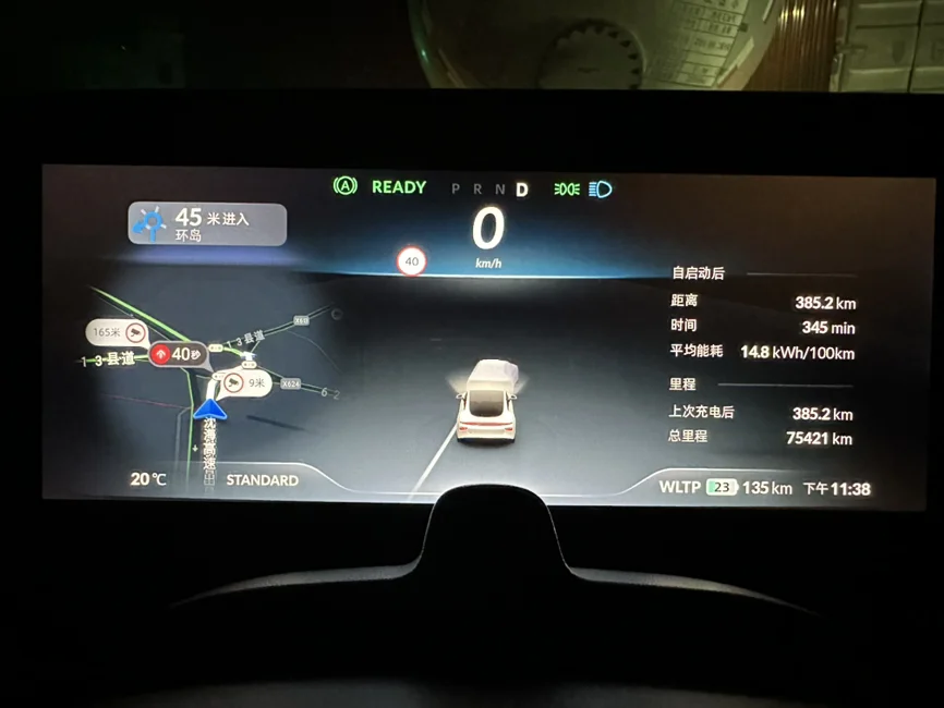 下高速了,还有18公里左右到目的地。这时,表显WLTP还剩135km,走了385.2公里。续航打折率在八六折左右。能耗一直在14.8这样。
