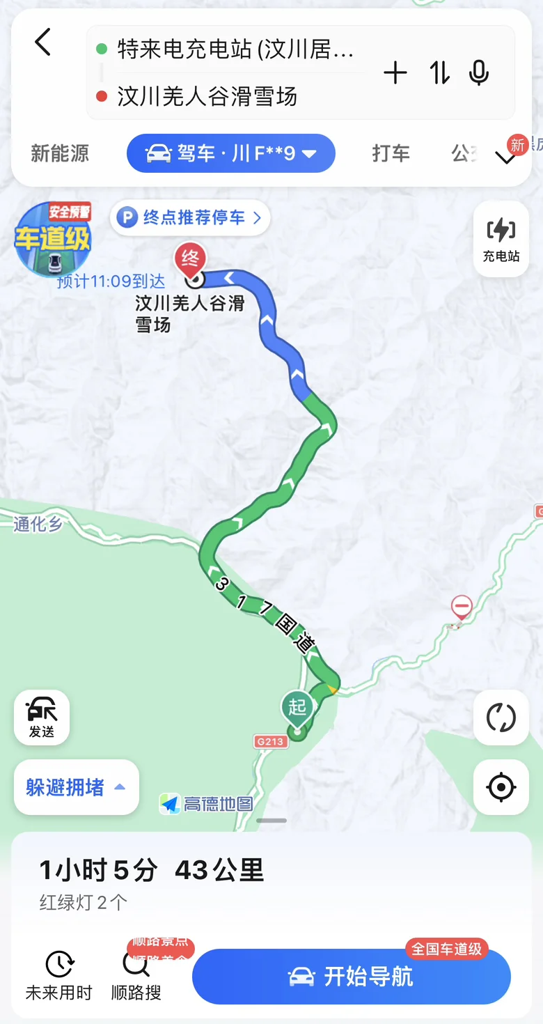 充到90%即可出发前往滑雪场。距离43公里,上坡路能耗较大,平均能耗在47,但是不必担心,返程时动能回收会补回来
