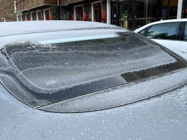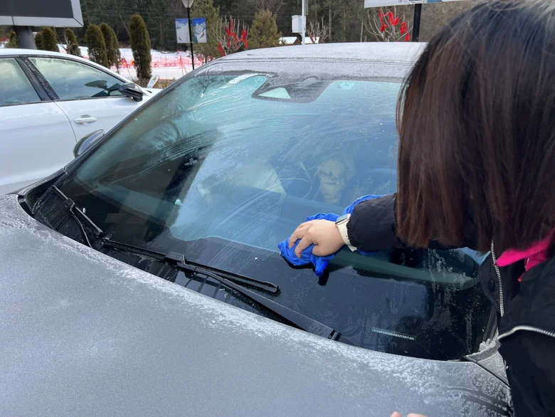 在四川第一次看到小P披上冰衣。这里我主要采取了两种方式,一是挡风玻璃加热,给玻璃上的冰加温;二是手指配合洗车毛巾,用手指的劲擦除车上的冰