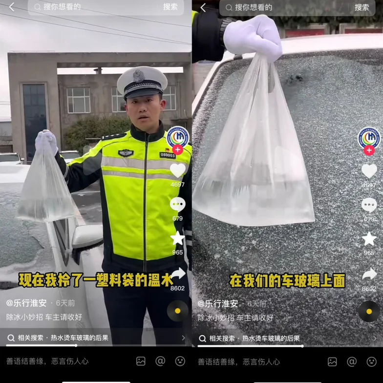 在抖音上看到交警普及,拧一口袋温水在车窗玻璃上滚动,也可以有效除冰,下次可以试试