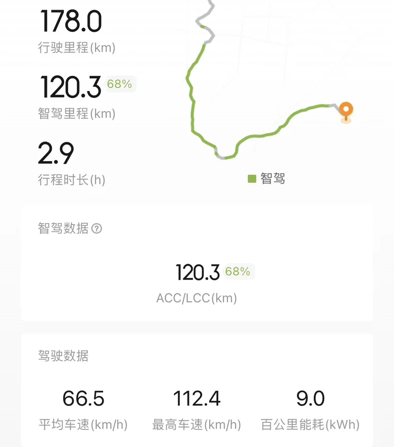 返程全程下坡路,178公里的路程平均能耗9.0kWh/100km,智驾120公里,占比68%,除了山路都可以用智驾降低驾驶疲劳