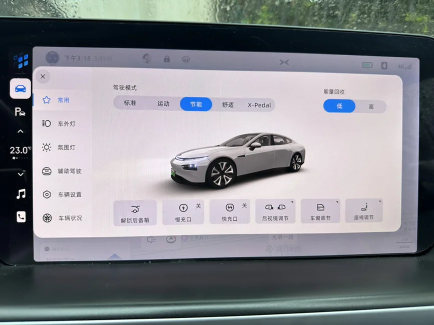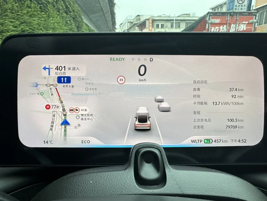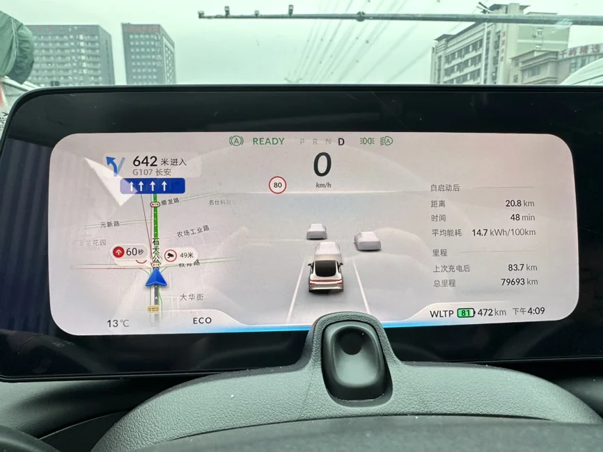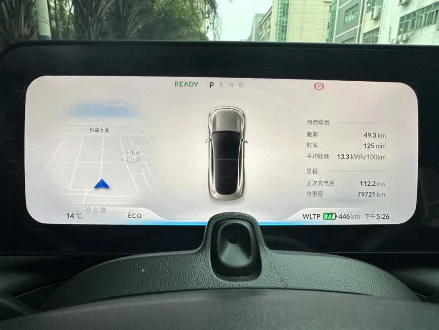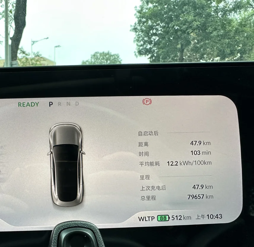 中午休息了一下,找了地方吃了饭。然后继续返程的测试。进车里先把模式切换成节能模式,能量回收不变,还是低回收。