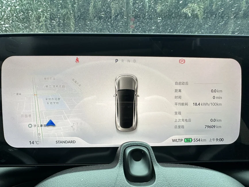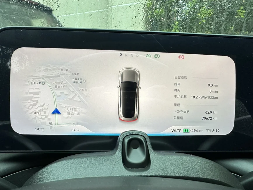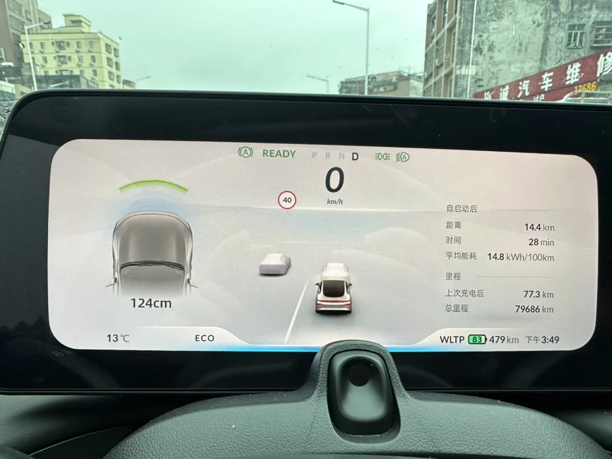 走了14.4公里后,仪表盘上的WLTP剩余479公里,也差不多在1:1续航达成率状态下,能耗在14.8,这个能耗不算高也不算低。毕竟雨天算正常水平吧。