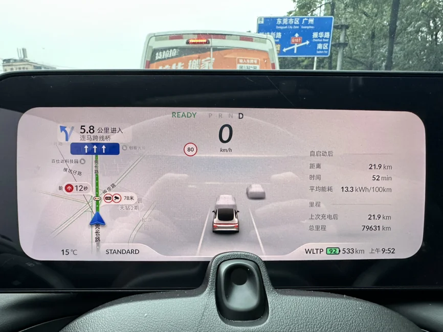 走了21.9公里,WLTP表显还剩533公里,能耗13.3算比较好的能耗表现。毕竟雨天相对晴天风阻会大一点点。不过续航达成率在1:1。