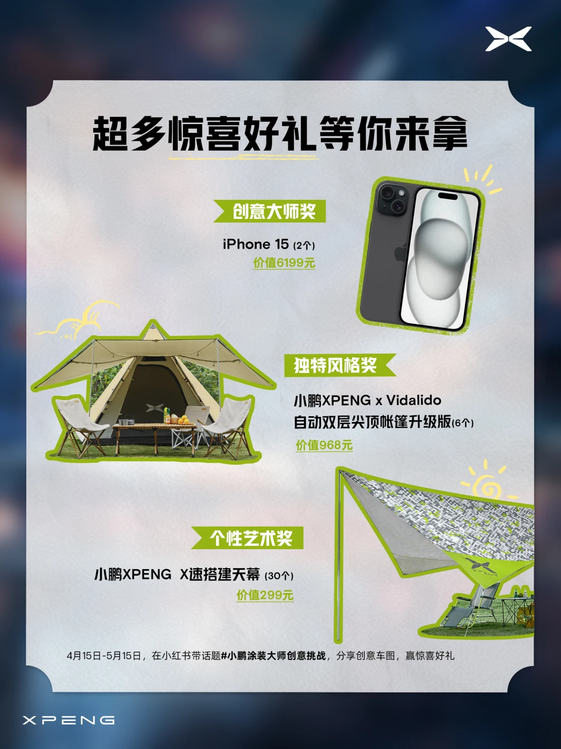 在小红书平台带话题#小鹏涂装大师创意挑战# ,并@小鹏汽车 官方小红书账号,上传小鹏App社区涂装页面生成的G6或X9创意车图,或者可以上传G6或X9车型改色、涂鸦美图,有机会获得iPhone 15等大奖。