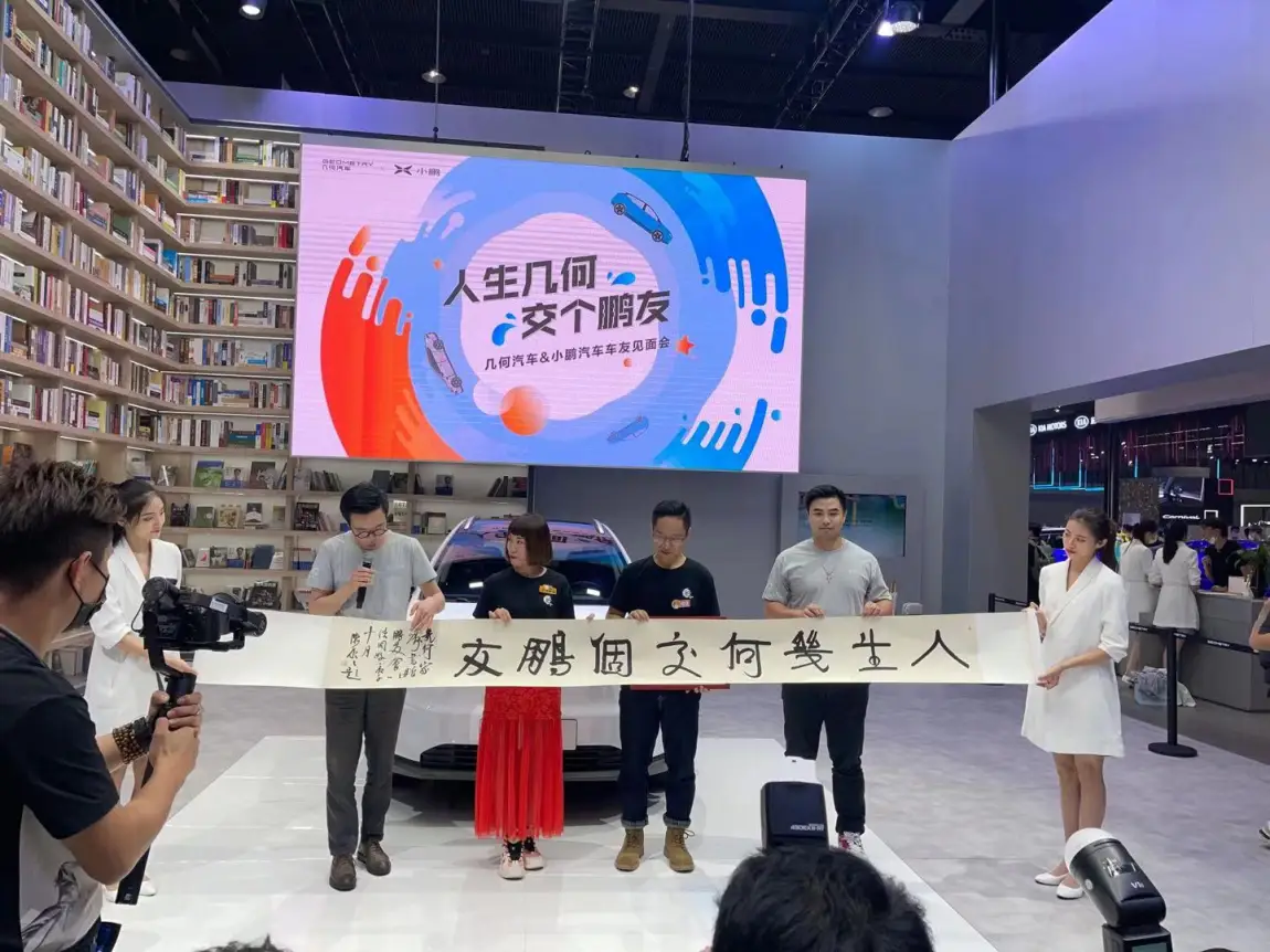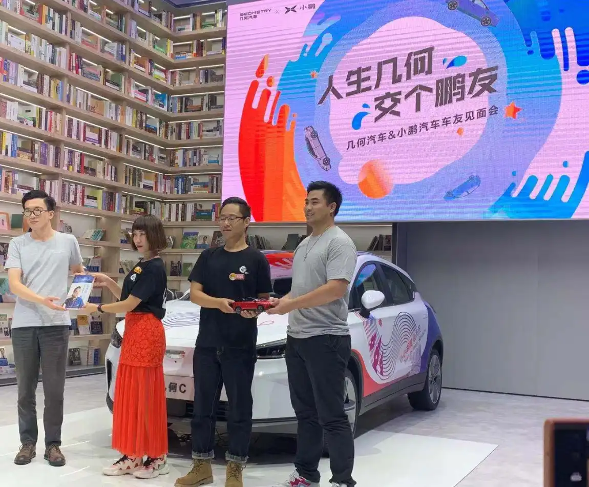 在互动提问环节过后,两位小鹏车主@我是媛媛 @Julian 以及两位几何车主进行了分享他们的用车故事和感受。之后是交换礼物和会旗。