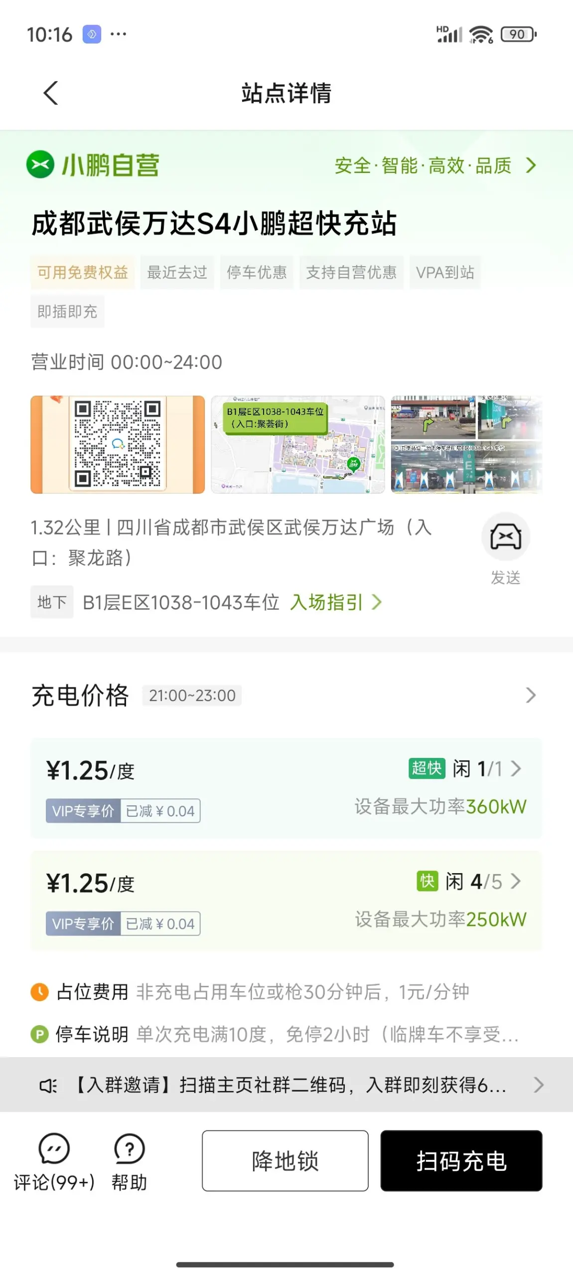 如何找到一个充电快人又少桩又多的地点的,很多车友会用第三方的充电软件,这里我推荐大家用小鹏自带的充电地图里面会详见显示这个城市小鹏自营的充电桩的位置。一方面自家车型肯定跟自己的充电桩适配程度最高,另外一方面有很多车友有积分,而积分是可以在小鹏自营的充电桩进行使用并且抵扣充电费用的同时,可以从充电桩地图中方便地找到充电地点的入口。