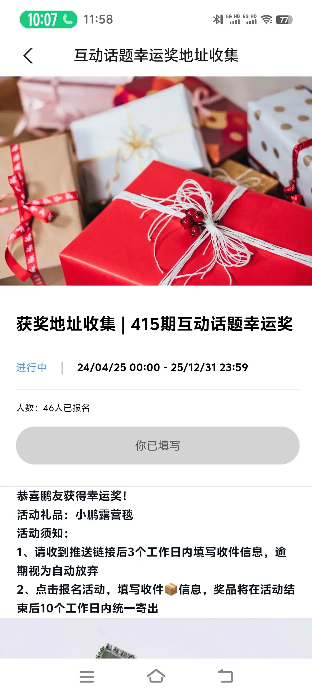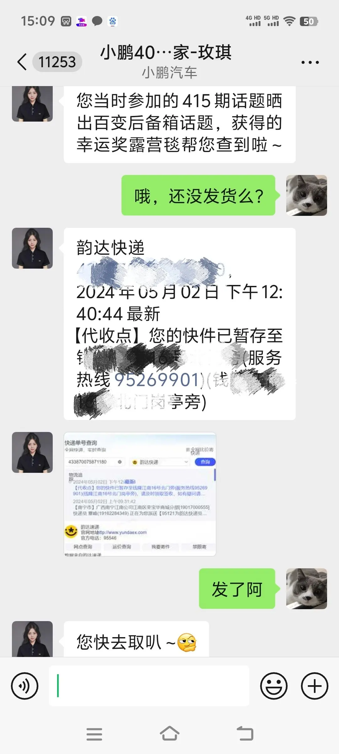 四月份我参加了小鹏app某一期互动话题的征文,幸运的被抽中,作为买了多年彩票从未中过的我难得中奖,其心情是非常激动的,我知道中奖的消息还是app上系统消息提醒的,几天后,系统又通知填写奖品收货地址,并承诺10个工作日之内寄出。几天后就是五一长假,我自驾出行不在家,期间接到几个快递员电话,快递小哥通常比较忙,只会先问你在不在方便不方便出来取快递,一旦你回答不在家,快递员就说货物放在某个驿站了,然后就代签收了——这种情况就会导致如果你同时网购了一些东西,就很难对应上快递员说的具体是哪样东西,因为快递员也不可能知道你买的东西是什么。如果是网购平台(淘宝京东拼多多等),还可以在订单的物流信息里查到货物状态以及收货码等等,小鹏商城同样也可以查物流信息。但是这个小鹏社区互动话题的奖品不是以商城订单形式发货,是没法查到物流信息的,即便你接到快递员电话,除非马上去取,否则是很难知道它最后被放在哪里的,何况我家附近有五六个驿站。
