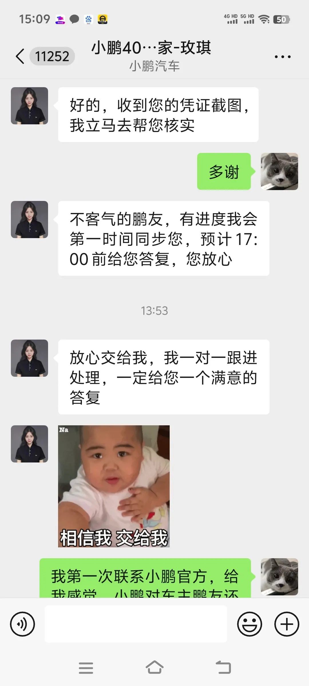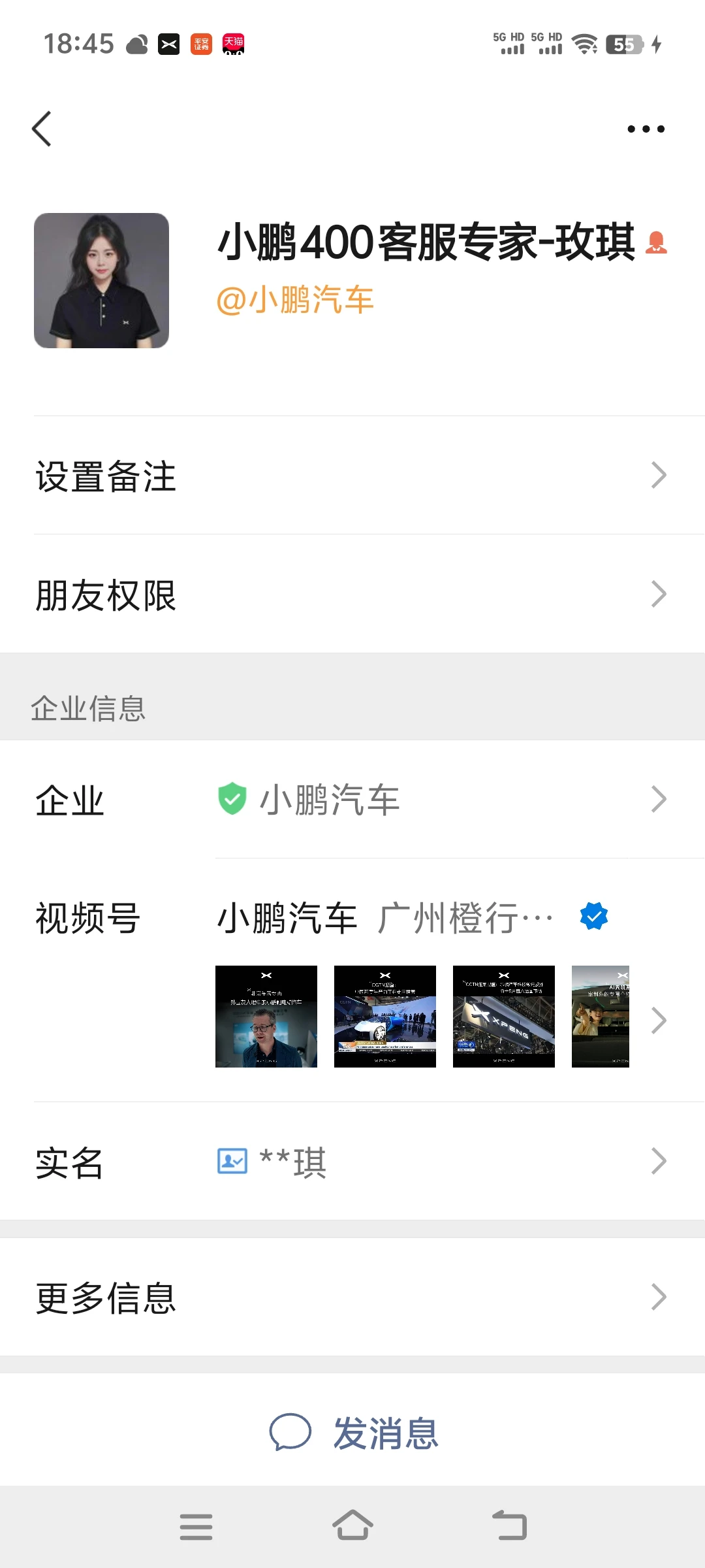 几分钟后,短信就来了,我根据短信上的链接提交了相关截图,并加了企业微信,这是名为:小鹏400客服专家——玫琪的小姐姐,值得一提的是,这个企微是一对一服务的,类似专员性质。