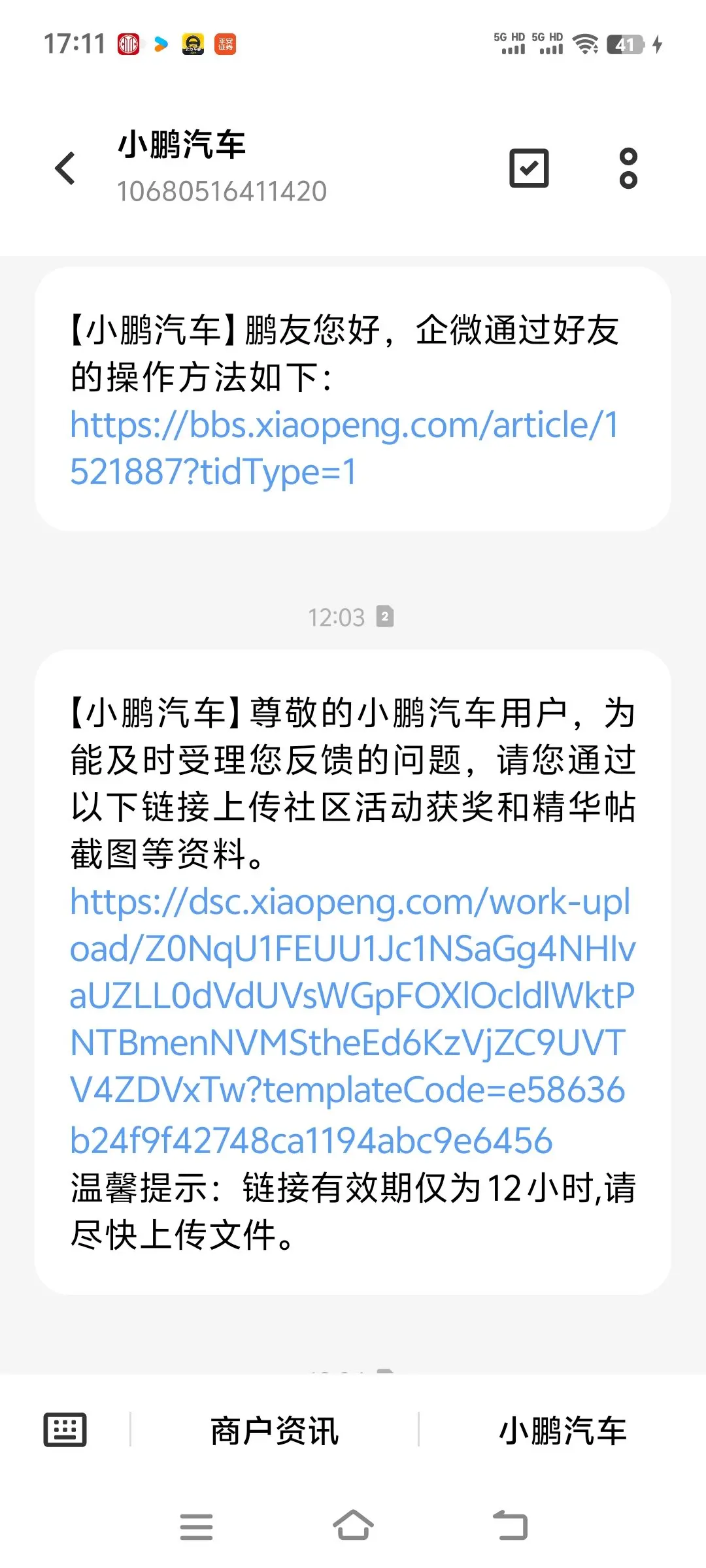 电话拨通之后,选择了某一类问题的数字,有人工客服小姐姐(这应该是第三方外包公司)接听,我描述了我的问题,她进行了登记并转到对应的小鹏客服坐席(这应该就是小鹏官方自己的客服),客服小姐姐咨询了我的问题所在,让我把这个互动话题的名称告诉她,我如实回答,她在后台中找到该话题,给我发了一个短信链接,让我点击链接上传和问题相关的凭据,并让我加一个客服的企业微信,通过微信和我进行下一步沟通。