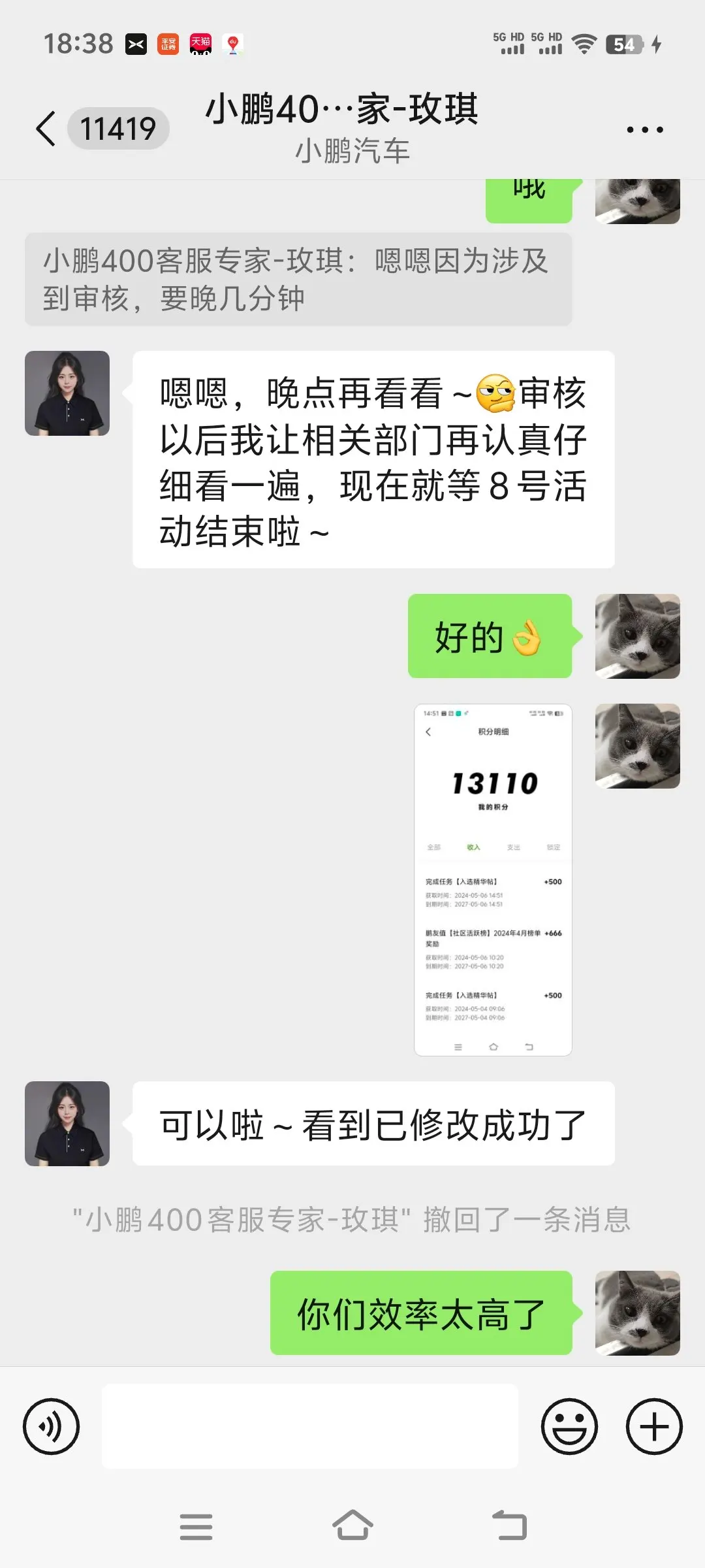 希望小鹏社区能在用户标签分类(参考微博黄标蓝标等划分或者其他论坛用户分类,不仅仅是分车型,或者认证自媒体)、用户阶梯化(勋章等级可以部分体现出哪些是优质用户,或者增加某些勋章,例如根据发帖量和被推荐加精数增加一枚“妙笔生花”勋章,优质的用户可以比普通用户多一些诸如发图增多、推荐概率权重增大的权限),以及奖惩机制、用户和管理员的沟通上(例如增加一个问题交流区,用户可以在上面和管理员反映问题,而不是像我今天打400电话和加企业微信解决)能有更好的改进。也希望更多的鹏友通过我的案例了解到400热线这个与小鹏官方沟通的方式。
