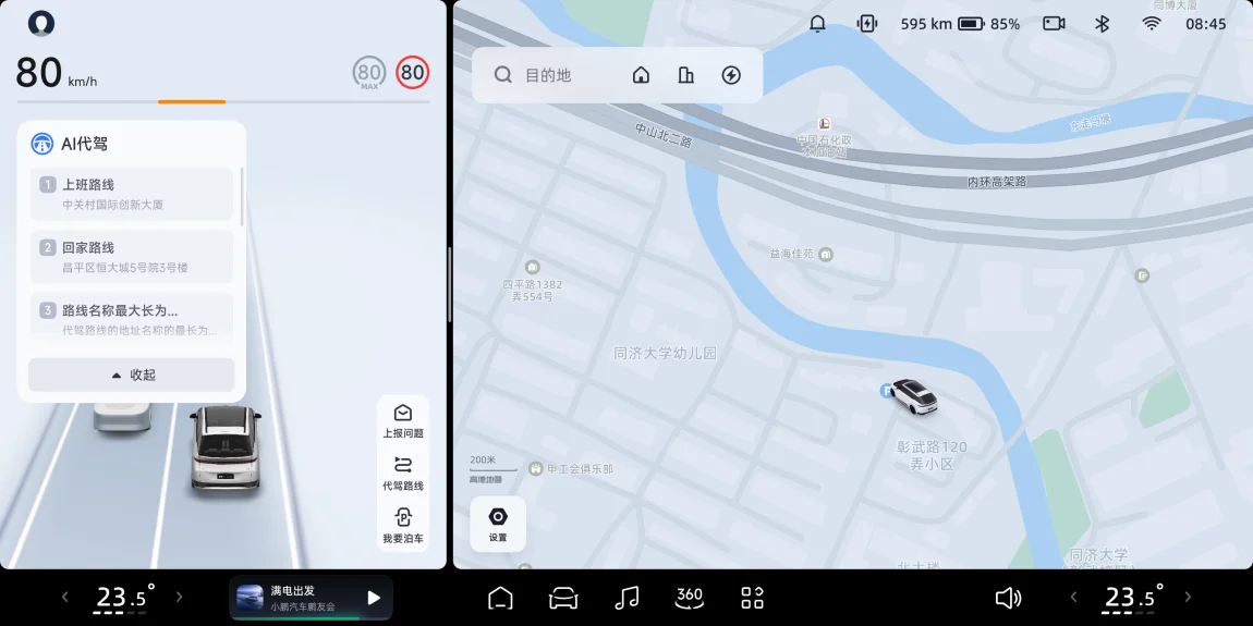依托于AI自主学习和XNGP泛化能力,AI代驾不依赖XNGP开城节奏,在全国任何一座城市的一般道路皆可使用,包含高速公路、城市快速路、城区主次干道、乡镇道路、以及多属性复合路线等。单个用户可储存10条记忆路线,单条路线最长可达100km,可满足用户所有常用出行场景。