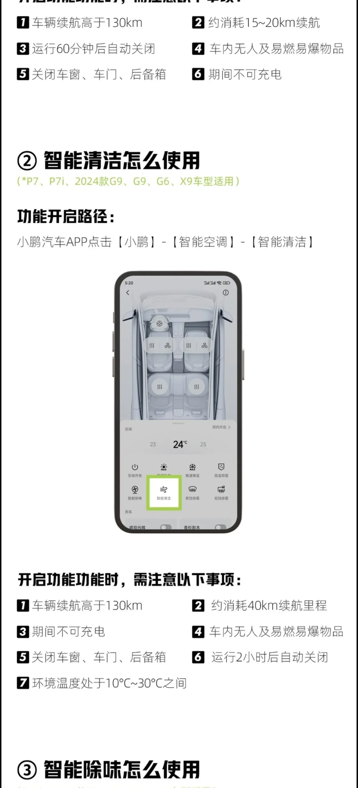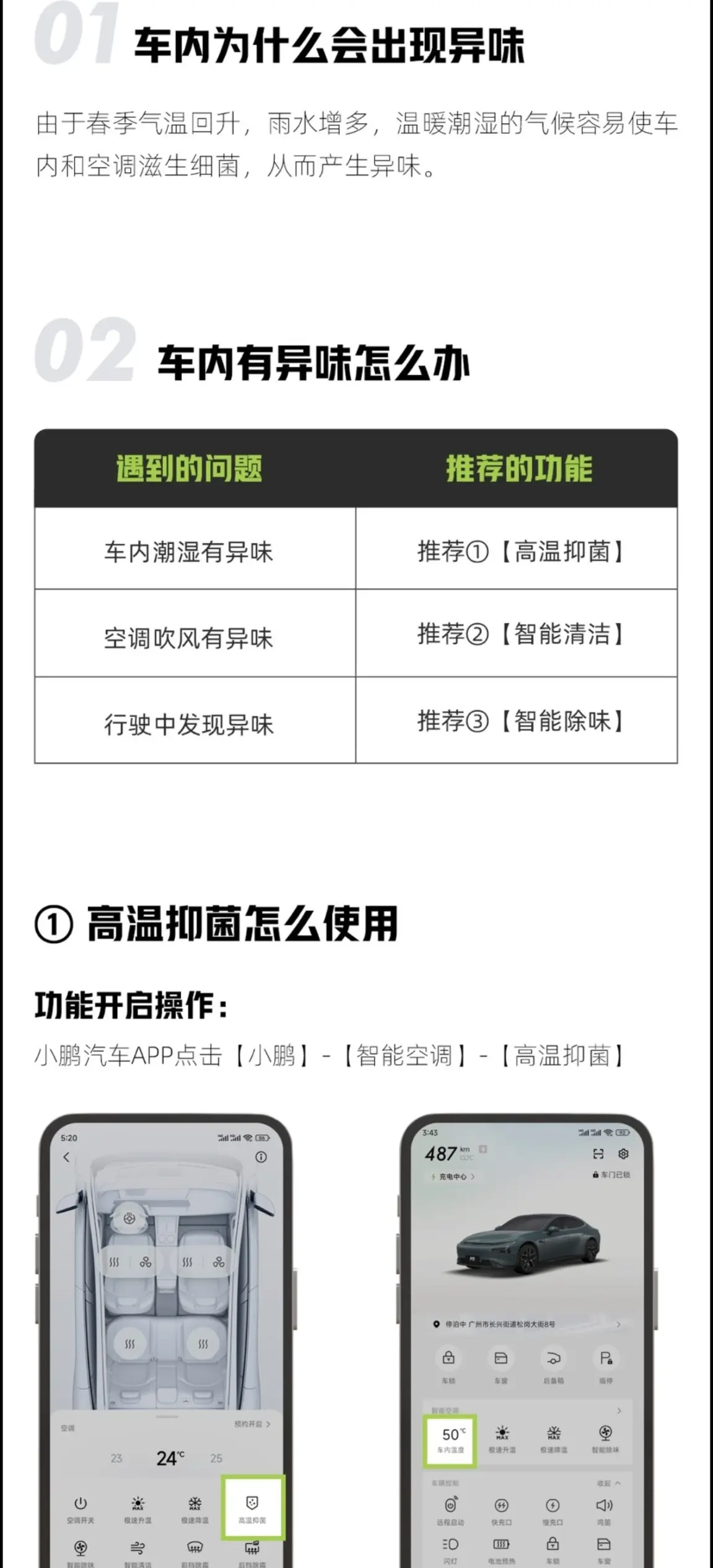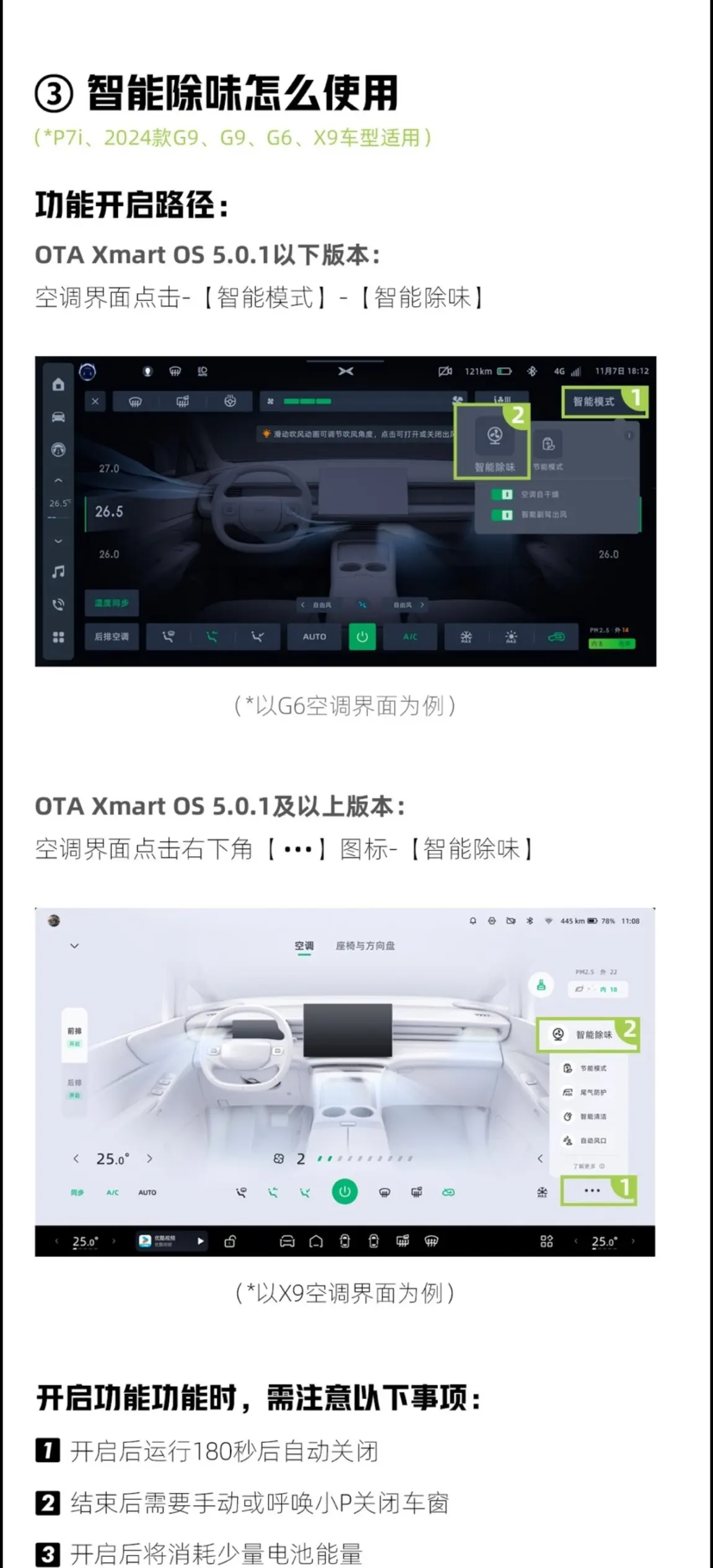 咱们小鹏的车子还有很强大的智能除味、杀毒抑菌的功能,建议打开使用,效果也不错。APP上车机里都有。具体可以参考下图。