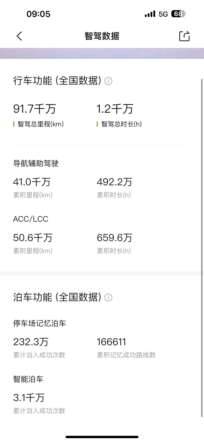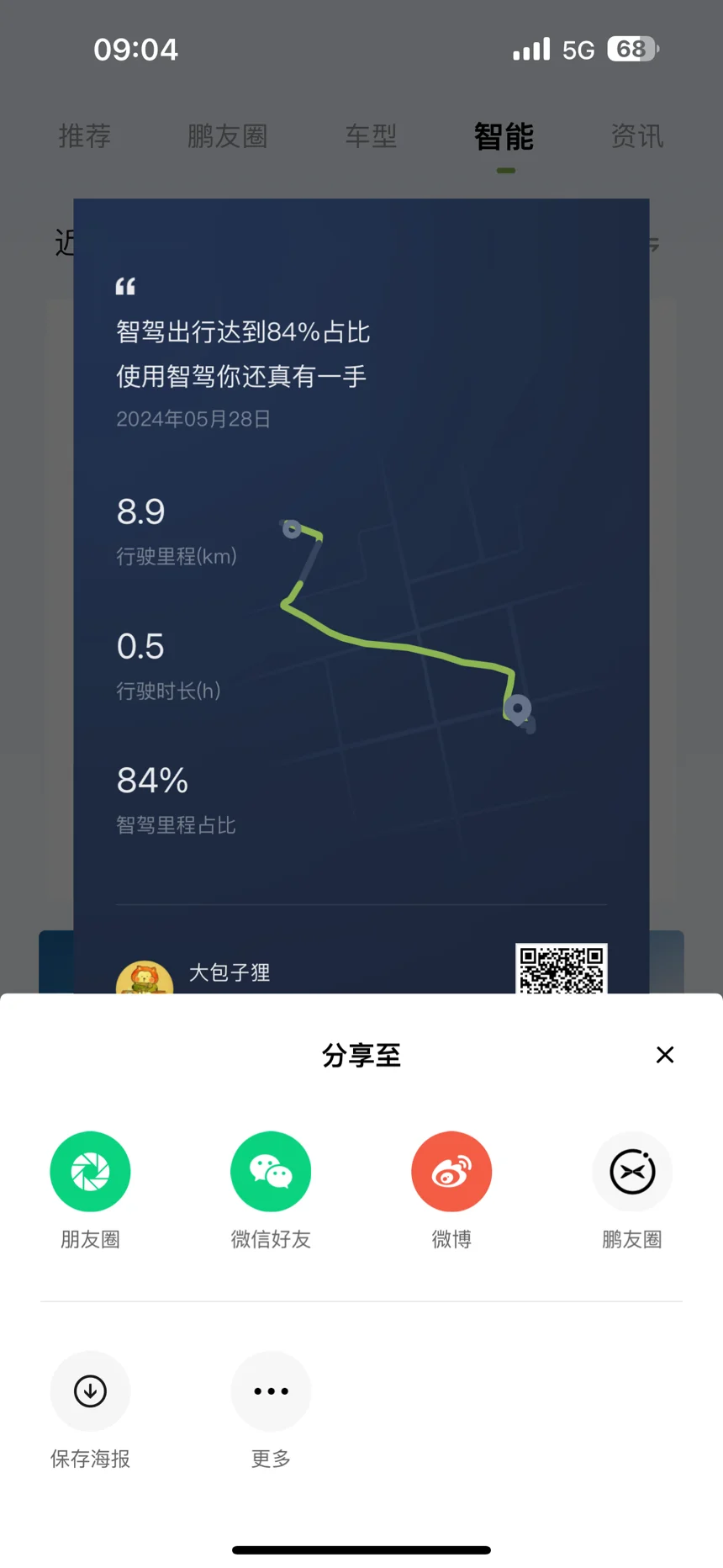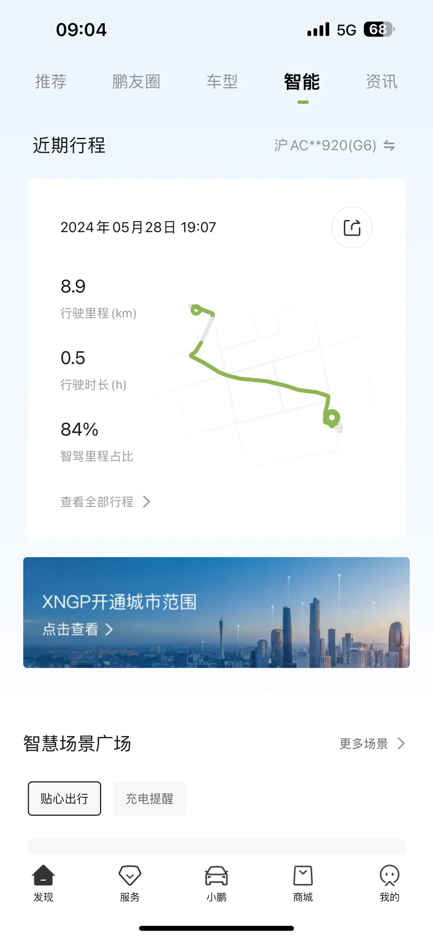 1.智能分享。在“首页-智能”页面中,在右上角增加了单个行程的分享功能,可以把自己甚至是整个小鹏的智驾行程情况分享出去,但数据还是比较少,作为一个主打智驾的品牌,还是有点太不应该了。
